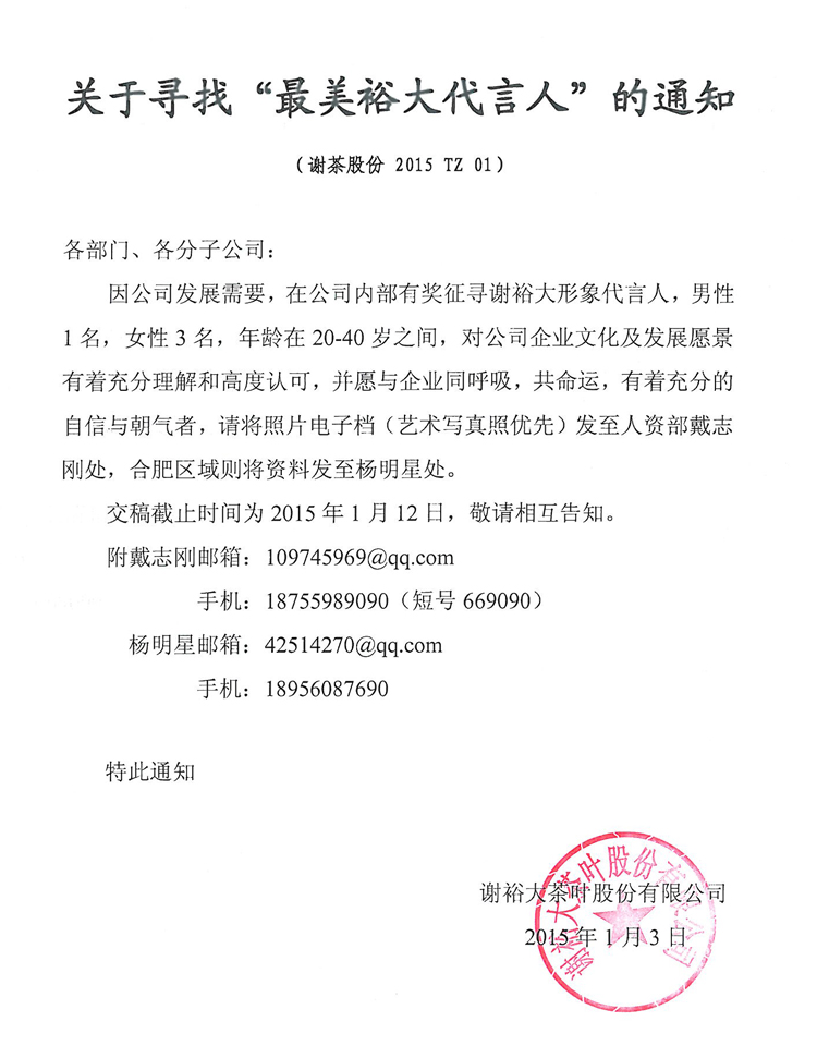 因公司發(fā)展需要,在公司內(nèi)部有獎(jiǎng)?wù)鲗ぶx裕大形象代言人,男性1名,女性3名,年齡在20-40歲之間,對(duì)公司企業(yè)文化及發(fā)展愿景有著充分理解和高度認(rèn)可,并愿與企業(yè)同呼吸,共命運(yùn),有著充分的自信與朝氣者,請(qǐng)將照片電子檔(藝術(shù)寫(xiě)真照優(yōu)先)發(fā)至人資部戴志剛處,合肥區(qū)域則將資料發(fā)至楊明星處。