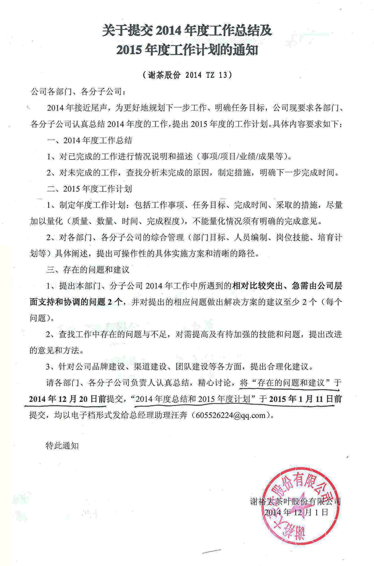 請(qǐng)各部門、各分子公司負(fù)責(zé)人認(rèn)真總結(jié),精心討論,將“存在的問題和建議”于2014年12月20日前提交,“2014年度總結(jié)和2015年度計(jì)劃”于2015年1月11日前提交,均以電子檔形式發(fā)給總經(jīng)理助理汪奔(605526224@qq.com)。