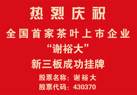 2013年12月31日,謝裕大茶葉股份有限公司首家通過(guò)全國(guó)中小企業(yè)股份轉(zhuǎn)讓系統(tǒng)(即:新三板)的股票掛牌申請(qǐng)受理,并于1月24日正式掛牌上市——股票代碼:430370、股票名稱(chēng):謝裕大。