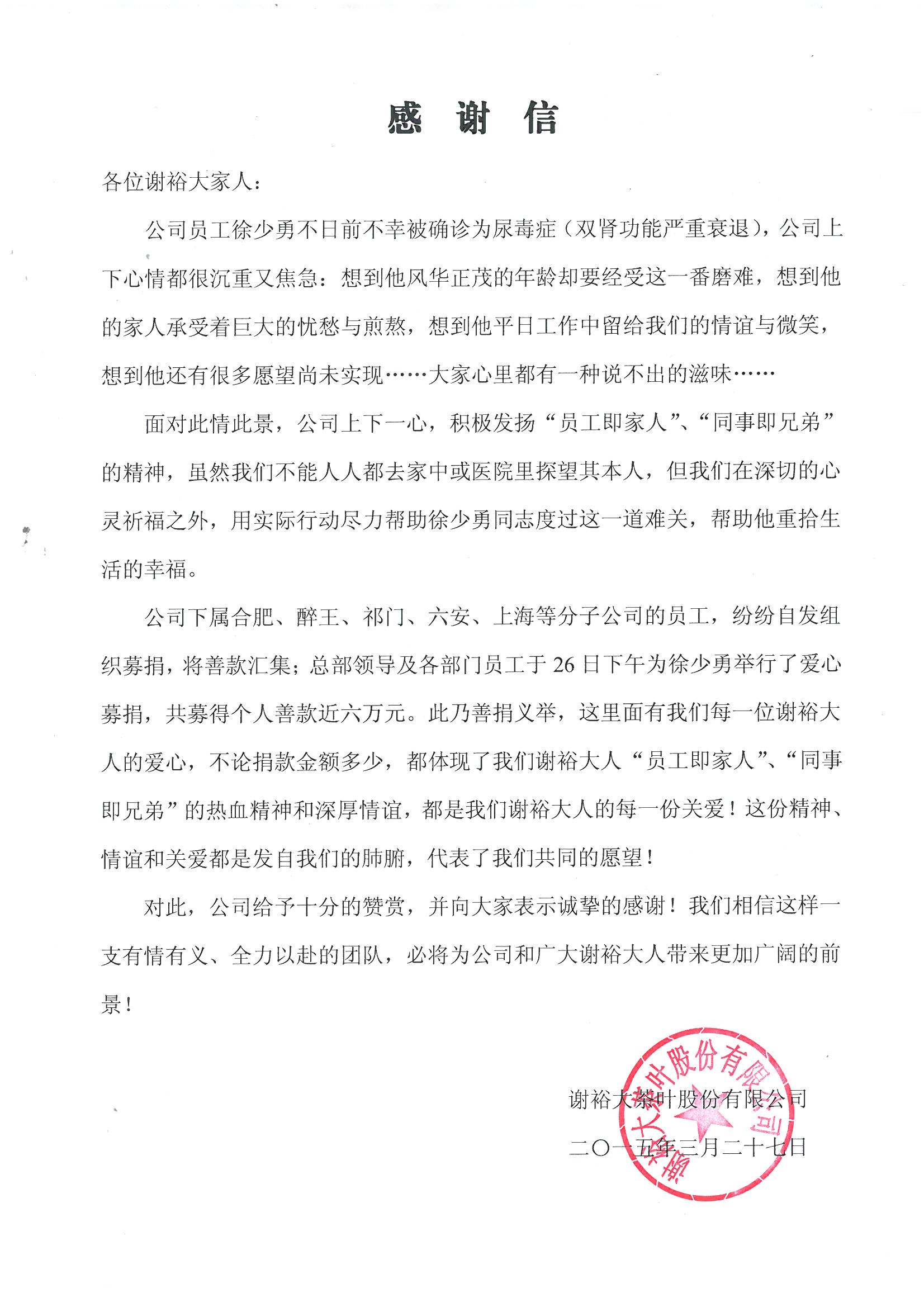 本次愛心募捐活動(dòng)彰顯了謝裕大一家人的相互關(guān)心、幫助和“企業(yè)有大愛”的正能量,共收到個(gè)人善款近六萬(wàn)元。
