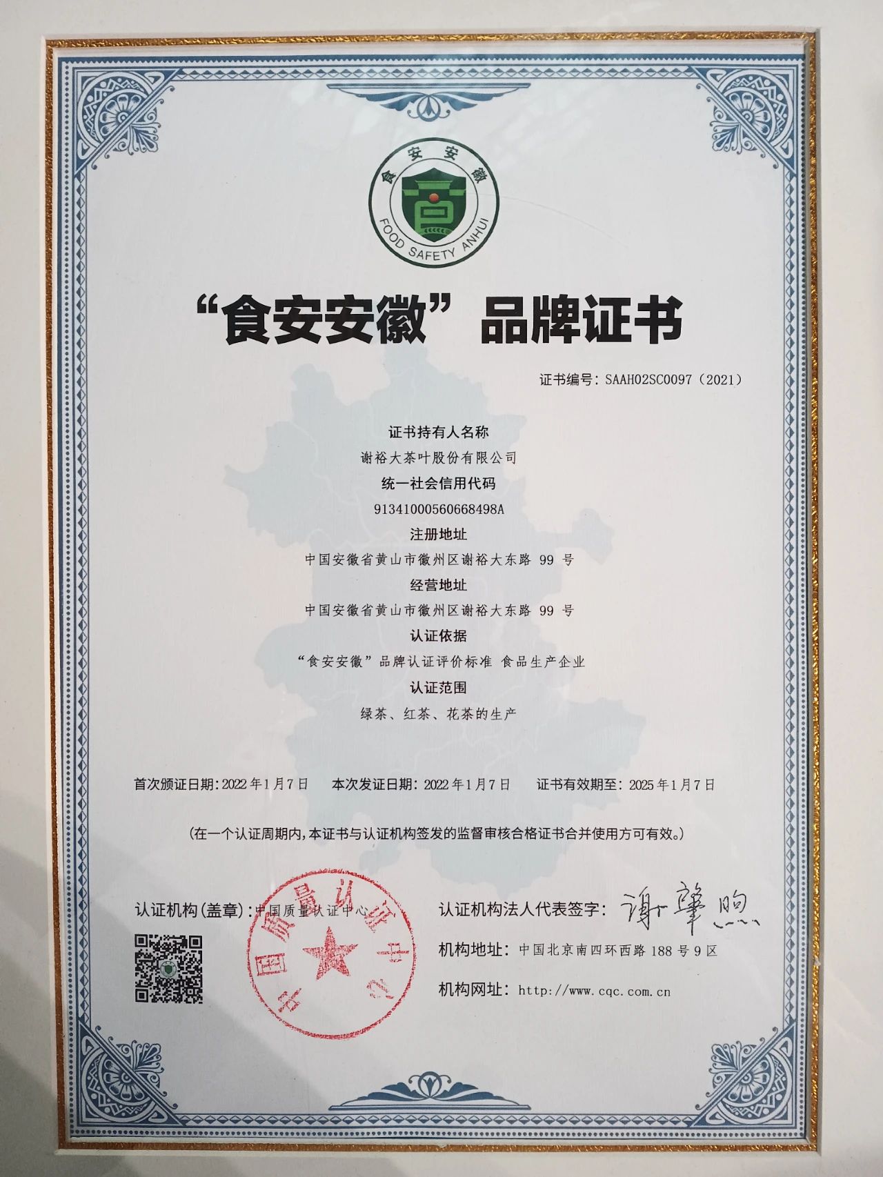正是這份對食品安全的嚴(yán)苛把控、對技術(shù)創(chuàng)新的不斷追求、對品質(zhì)堅守的始終如一,讓謝裕大建立和通過ISO9001、ISO22000、ISO50001、ISO14001和ISO45001等多項體系認(rèn)證,也榮獲了“食安安徽”首批認(rèn)證企業(yè),“安徽省質(zhì)量獎”、“安徽省企業(yè)標(biāo)準(zhǔn)化良好行為AAA級示范企業(yè)”等榮譽(yù)。未來,我們也希望用更高標(biāo)準(zhǔn)、更高品質(zhì)的徽茶,增強(qiáng)“食安安徽”品牌影響力,助推黃山綠色食品高質(zhì)量發(fā)展,也讓世界感受到中國茶的盎然芬芳。
