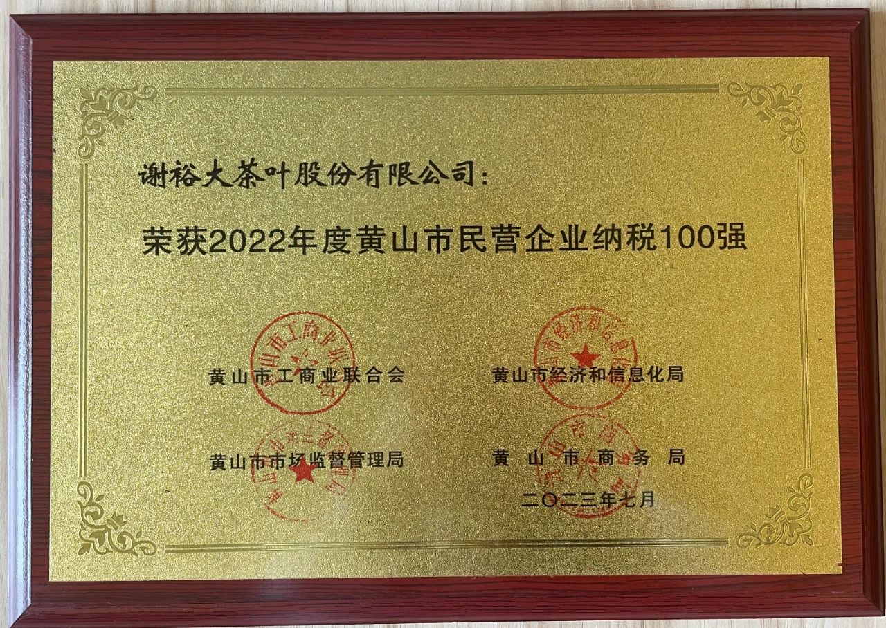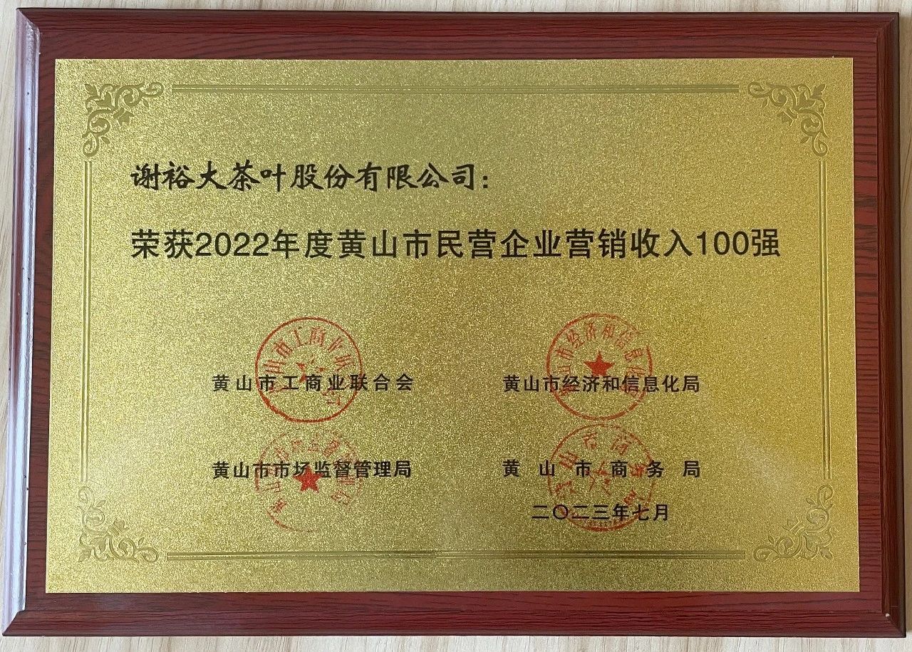 近日,黃山市工商聯(lián)、市經(jīng)信局、市商務(wù)局、市市場(chǎng)監(jiān)督管理局、市統(tǒng)計(jì)局聯(lián)合發(fā)布的2022年度黃山市民營(yíng)企業(yè)百名排序結(jié)果公布,謝裕大茶葉股份有限公司榮獲2022年度黃山市民營(yíng)企業(yè)營(yíng)銷(xiāo)收入100強(qiáng)、2022年度黃山市民營(yíng)企業(yè)納稅100強(qiáng)雙項(xiàng)榮譽(yù)。