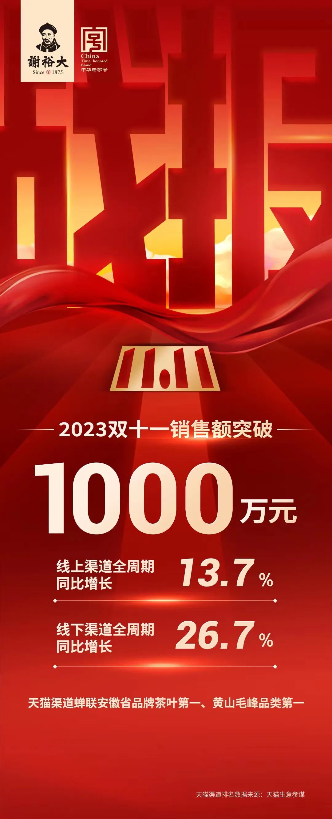 在謝明之的帶領(lǐng)下,謝裕大榮獲“2022年度茶葉綜合影響力十大品牌”,并且連續(xù)十多年被評(píng)為中國(guó)茶葉行業(yè)百?gòu)?qiáng)企業(yè)。與此同時(shí),謝裕大積極研究各類徽茶產(chǎn)品,屢獲行業(yè)大獎(jiǎng)。今年“雙十一”期間,黃山毛峰成為京東平臺(tái)最受關(guān)注的地域特色產(chǎn)品,“謝裕大”全渠道銷售額突破1000萬元,成為該平臺(tái)最受全國(guó)消費(fèi)者歡迎的“安徽品牌”,并蟬聯(lián)天貓渠道安徽省品牌茶葉第一、黃山毛峰品類第一,持續(xù)領(lǐng)跑徽茶。