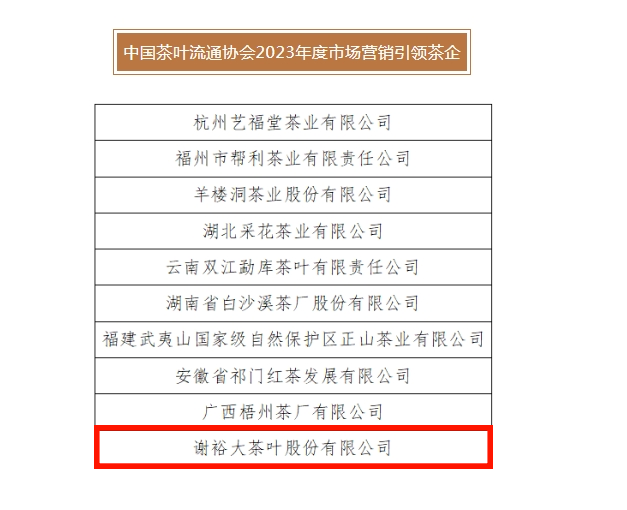 謝裕大榮獲“2023年度市場(chǎng)營(yíng)銷引領(lǐng)茶企”