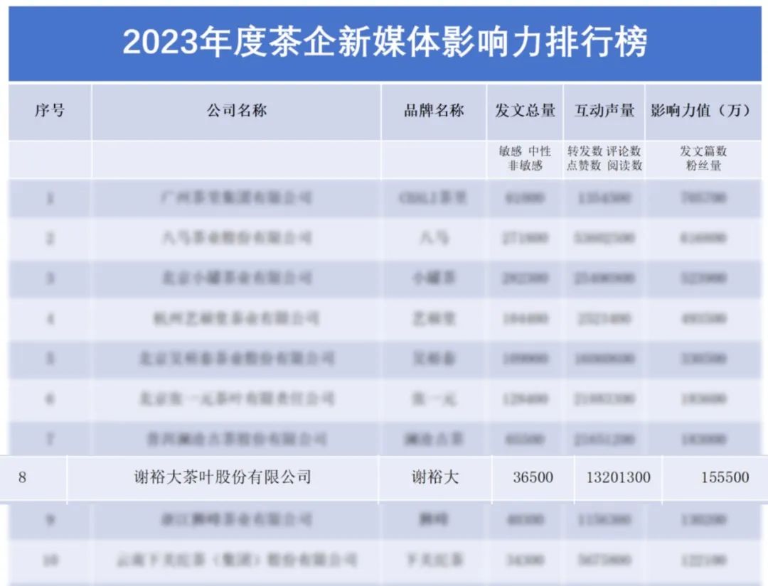 近日,中華合作時(shí)報(bào)·茶周刊輿情管理中心采集、編制的2023年度茶企新媒體影響力排行榜公布,謝裕大成功入榜,名列第8位,也是徽茶品牌首位。此次榜單涉及全網(wǎng)信息數(shù)據(jù),包含圖文、視頻、文件等,全息呈現(xiàn)茶企新媒體的年度傳播指數(shù)。