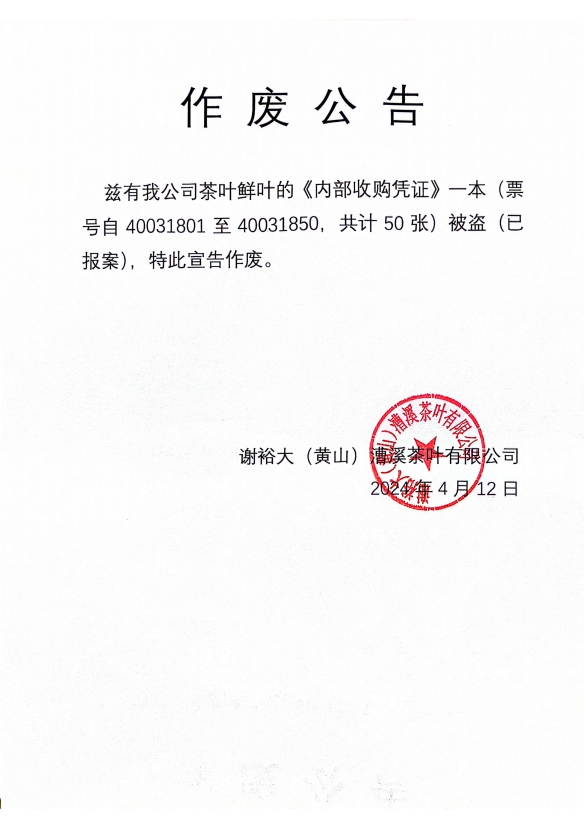 茲有我公司茶葉鮮葉的《內(nèi)部收購(gòu)憑證》一本(票號(hào)自 40031801至40031850,共計(jì)50張)被盜(已報(bào)案
