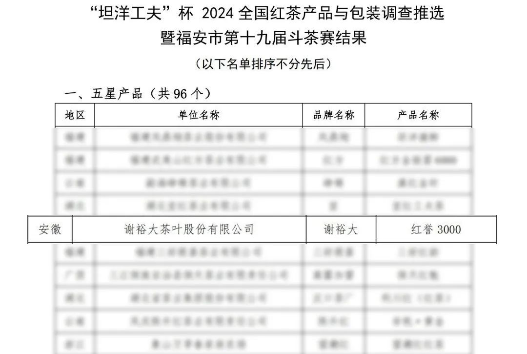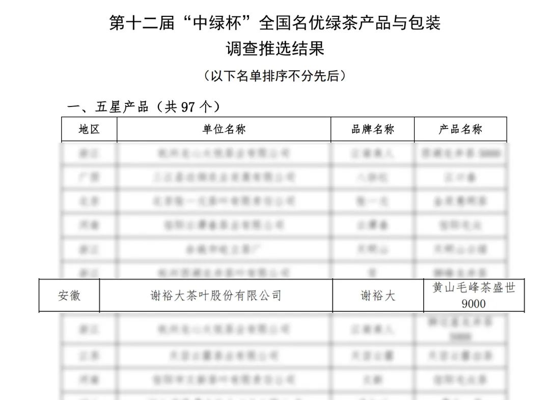 2024年5月30日,“第十二屆‘中綠杯’全國名優(yōu)綠茶產(chǎn)品與包裝調(diào)查”與“‘坦洋工夫’杯+2024全國紅茶產(chǎn)品與包裝調(diào)查推選暨福安市第十九屆斗茶賽”結(jié)果公布,謝裕大選送的產(chǎn)品黃山毛峰·盛世9000與祁門紅茶·紅譽3000從全國茶企中脫穎而出,分別在全國名優(yōu)綠茶與紅茶評比中斬獲“五星產(chǎn)品”兩個重量級大獎,以百年傳承的匠心與品質(zhì)為徽茶續(xù)寫濃墨重彩的榮譽篇章。