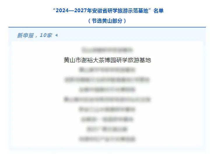 8月16日,安徽省文化和旅游廳發(fā)布《2024—2027年安徽省研學(xué)旅游示范基地公示》,其中黃山共10家新申報基地、3家申請復(fù)核基地擬被認(rèn)定為“2024—2027年安徽省研學(xué)旅游示范基地”,謝裕大茶博園憑借“茶研學(xué)”特色主題成功入選。