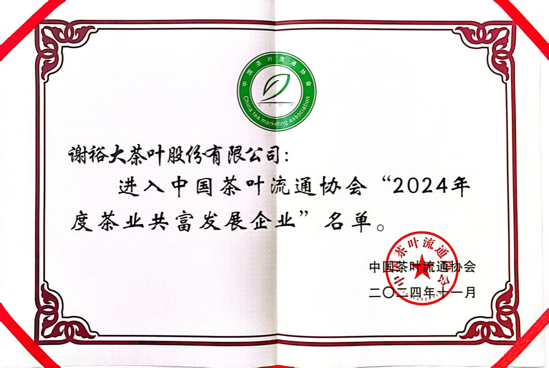 在11月30日的茶產(chǎn)業(yè)高質(zhì)量發(fā)展交流會(huì)上,謝裕大榮獲中國(guó)茶葉流通協(xié)會(huì)頒發(fā)的“2024年度茶業(yè)共富發(fā)展企業(yè)”榮譽(yù)。謝裕大在發(fā)展的過(guò)程中始終不忘聯(lián)農(nóng)帶農(nóng),不僅抓住“公司+基地+農(nóng)戶(hù)”聯(lián)合體新型經(jīng)營(yíng)模式,分工協(xié)作共同實(shí)現(xiàn)區(qū)域茶產(chǎn)業(yè)與相關(guān)產(chǎn)業(yè)的融合發(fā)展,帶動(dòng)茶農(nóng)脫貧增收,實(shí)現(xiàn)群眾致富、村集體增收、企業(yè)發(fā)展多方共贏成果。同時(shí),堅(jiān)持穩(wěn)中求進(jìn)的發(fā)展思路,對(duì)黃山毛峰茶產(chǎn)業(yè)聯(lián)合體內(nèi)農(nóng)戶(hù)進(jìn)行貸款擔(dān)保和貼息方式對(duì)農(nóng)民提供支持,變“輸血”為“造血”,變“主導(dǎo)”為“引導(dǎo)”,以企帶村推動(dòng)鄉(xiāng)村振興。