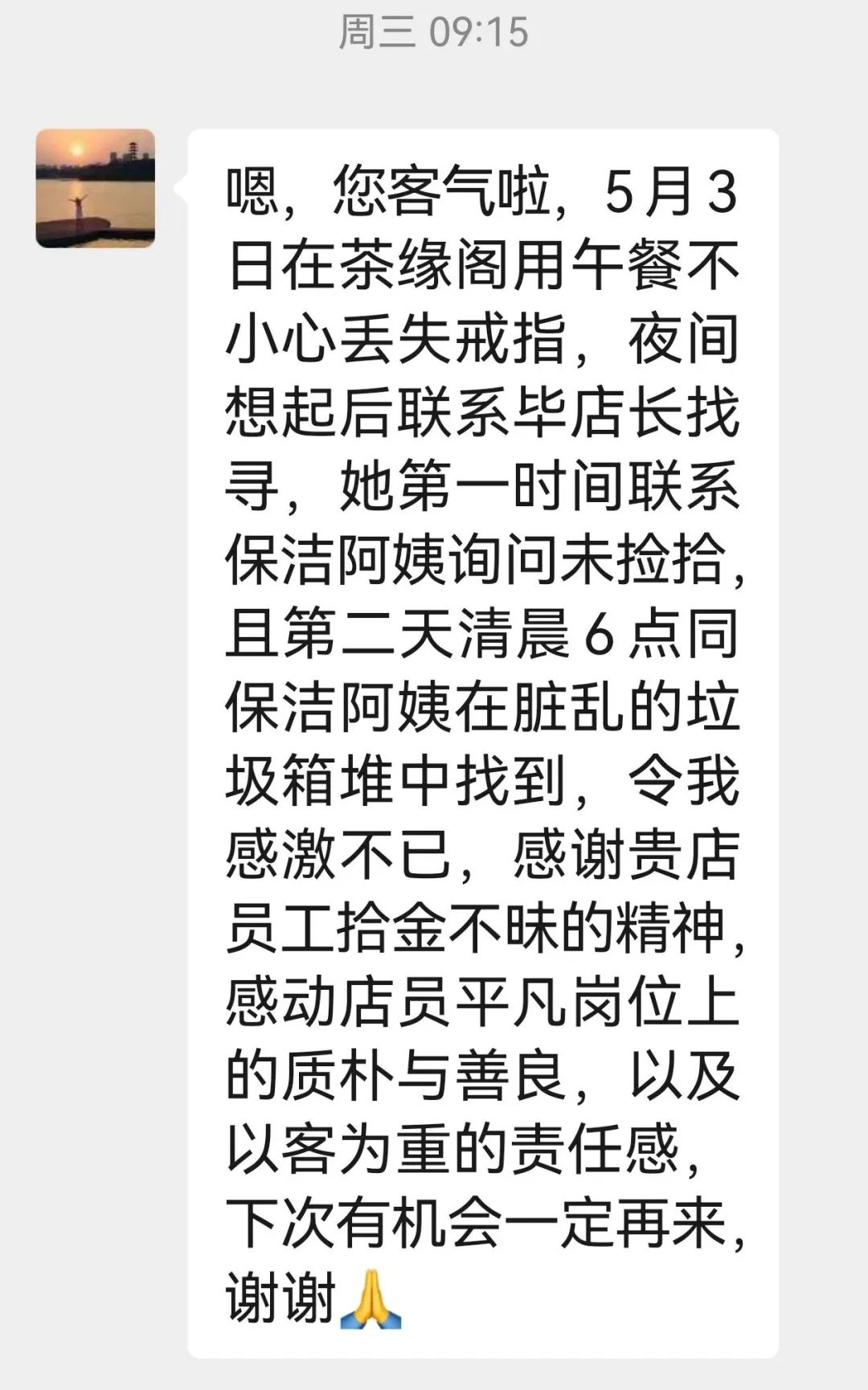 5月3日—4日,在徽州區(qū)謝裕大茶緣閣餐廳上演了一場爭分奪秒的“尋戒行動”。在主管畢芬與主廚桂飛飛的全力協(xié)作下,歷經(jīng)地毯式搜尋,終將客人遺落的貴重戒指完璧歸趙,用行動詮釋了“客戶至上”的服務理念。